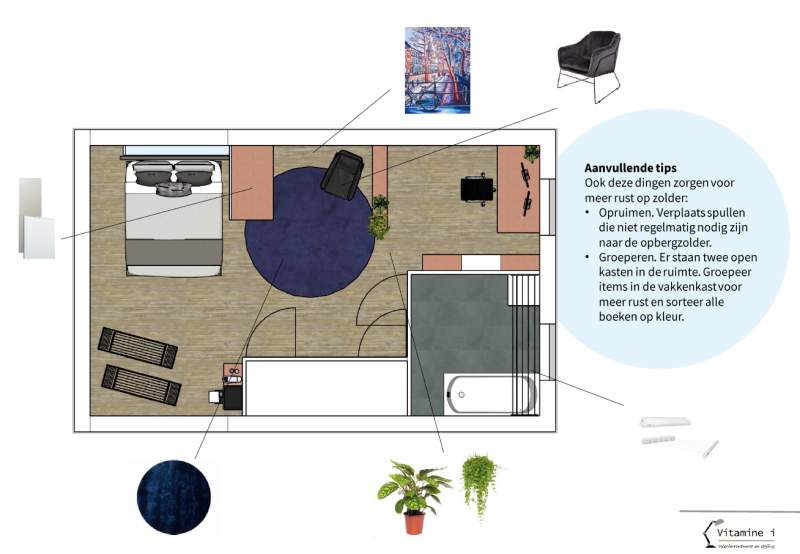Een stel uit Utrecht benaderde me om hen te helpen bij de herinrichting van hun zolderverdieping. Waar de ruimte hoofdzakelijk werd gebruikt als wasruimte, thuiswerkplek, opslagruimte en logeerplek, wilden zij deze ook gaan gebruiken als slaapkamer voor hunzelf. De logeerfunctie en één bureau mocht verdwijnen, maar het zou fijn zijn als er ook een plek gecreëerd zou worden voor ontspanning. Tot slot kreeg ik de opdracht om in mijn ontwerp zoveel mogelijk bestaand meubilair te gebruiken.