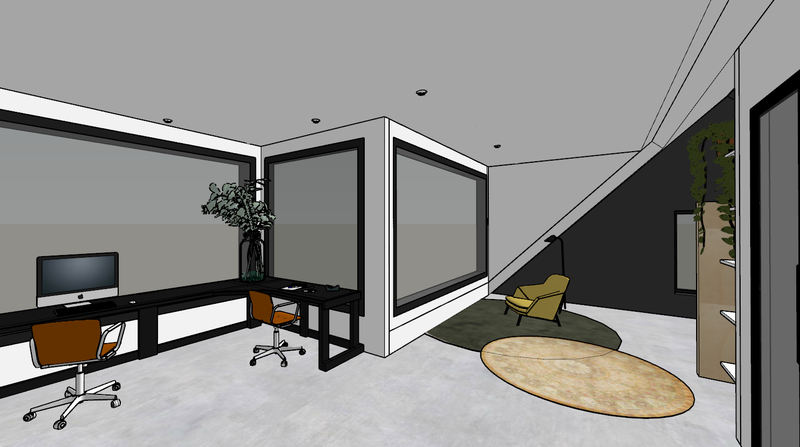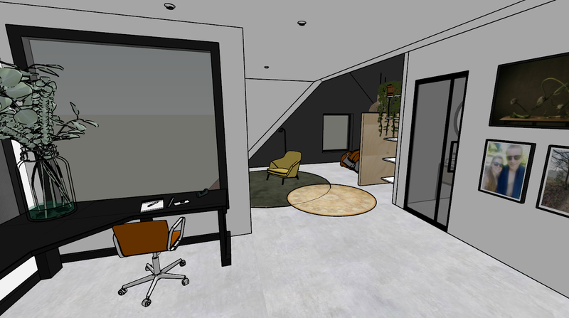 De bovenverdieping bestaat uit de slaapkamer, inloopkast, kantoor en de badkamer.