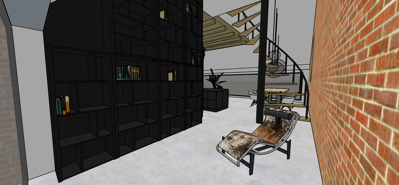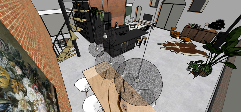 Een interieur met grote gebaren. Blikvangers als een bakstenen muur, grote glazen ramen met zwarte kozijnen, een matzwarte keuken met koperen achterwand achter. Zwarte wanden en plafond in de slaapkamer en een groot klassiek stilleven.