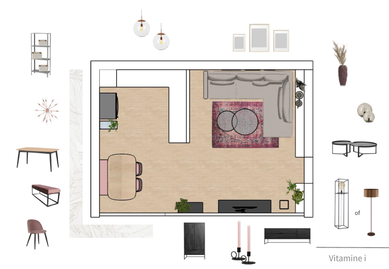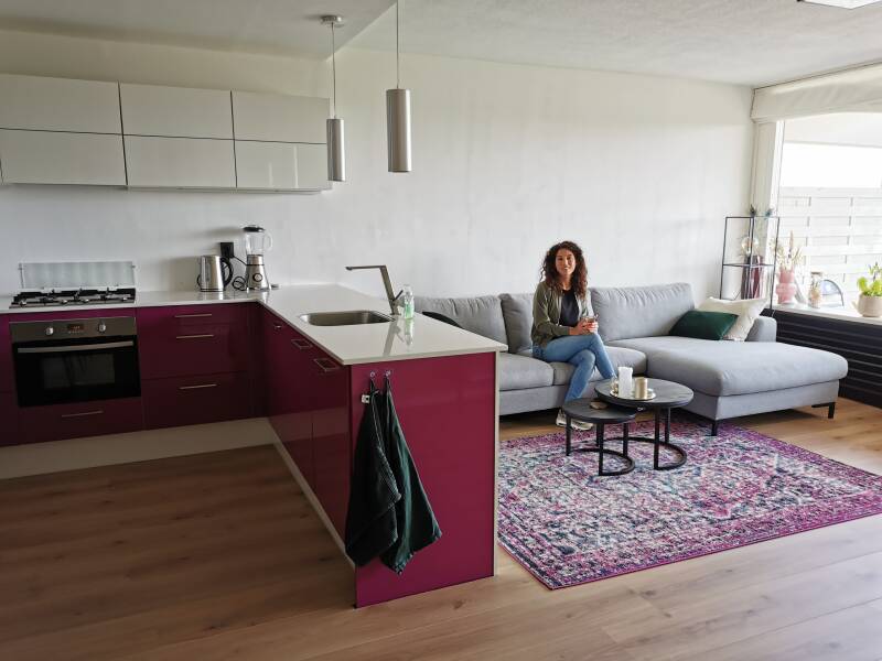 Voor een appartement in Haarlem maakte ik een meubelplan en gaf ik styling advies. Voor de woonkamer en keuken. De bewoonster kocht het appartement inclusief fuchsia kleurige keuken en riep mijn hulp in om er een mooi, sfeervol geheel van te maken. De wens was dan ook een sfeervolle ruimte die warm, luxe, zacht en eigen aanvoelt. Met ruimte voor foto's van dierbaren en gemaakte reizen.