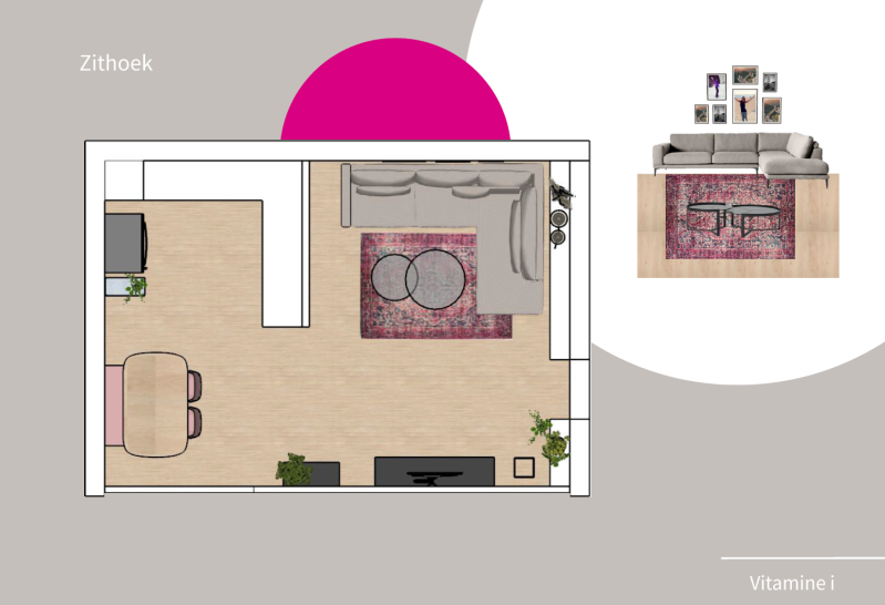 Om de zithoek aan te laten sluiten bij de keuken, koos ik voor een kleurrijk tapijt met daarin dezelfde kleur roze als de keuken. En een ruime bank om heerlijk op te ploffen na een dag hard werken. Worden de stoelen en het bankje uit de eethoek ernaast geplaatst, dan is er voldoende zitruimte voor heel wat bezoek. Familie en vrienden zijn dierbaar voor de bewoonster. Ze zag dan ook graag een plek terugkomen waar ze foto's van hen kon tentoonstellen. Ik adviseerde een 'wall of fame' boven de bank. Om het geheel rustig te houden met lijsten in de dezelfde kleur. En een onderste rand in een strakke rechte lijn.